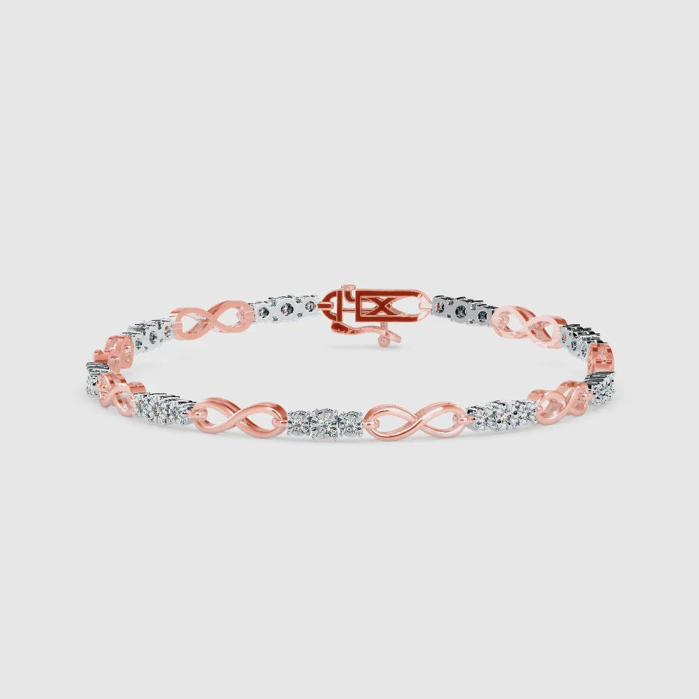 Forever Embrace BraceletThe Forever Embrace Bracelet, crafted with rose and white gold, features infinity symbols linked by radiant diamonds. A symbol of enduring love and unbreakable connections, it captures the essence of timeless devotion.